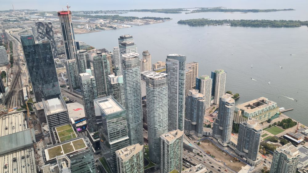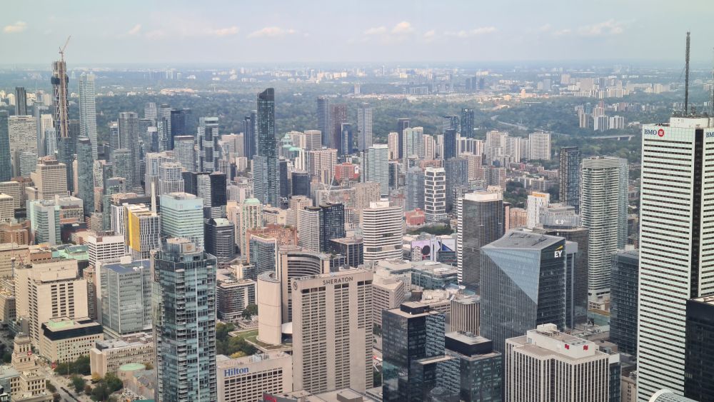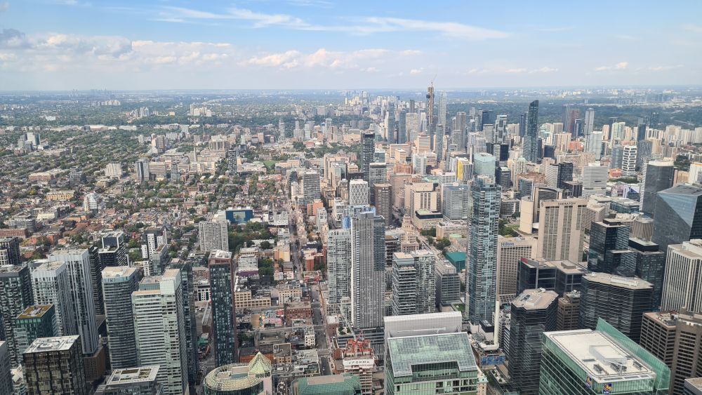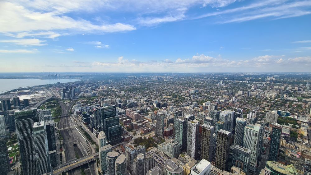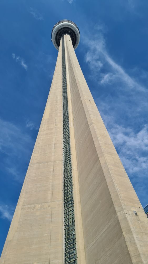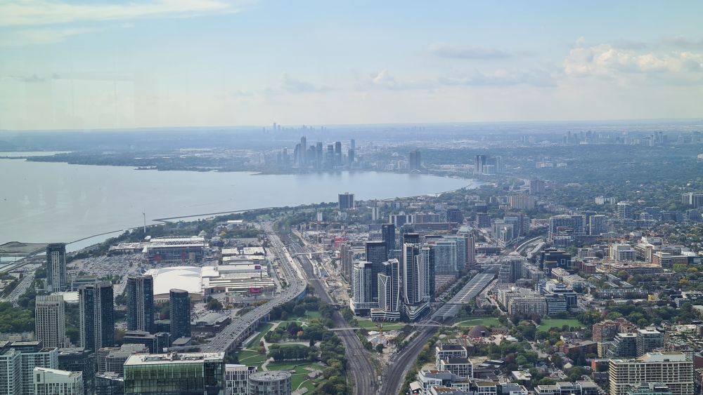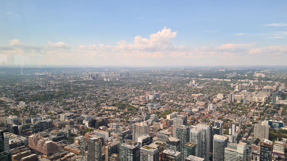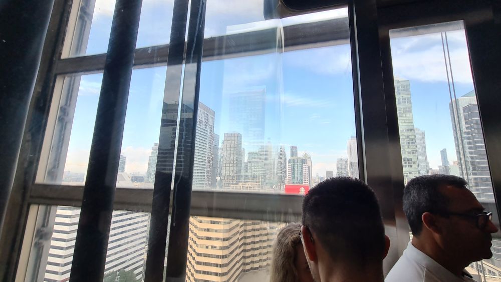 Wir sind dann weiter zum CN Tower. Die Eintrittspreise sind recht hoch, daher haben wir uns die Toronto-Card online gekauft, dort ist der Eintritt für den Tower und Ripleys Aquarium (direkt neben dem Tower) schon enthalten. Und weitere Attraktionen kann man sich dazu aussuchen. Mit der Card ging es dann zum Eingang und recht schnell waren wir auch schon im Aufzug, der teilweise verglast ist und so schon bei der Fahrt hinauf schöne Aussichten bietet. Noch schöner wird es dann auf der Aussichtsplattform.