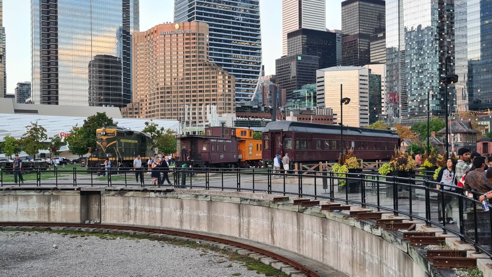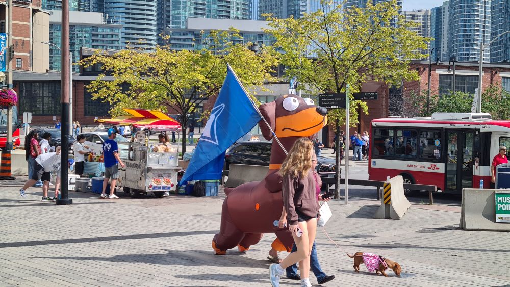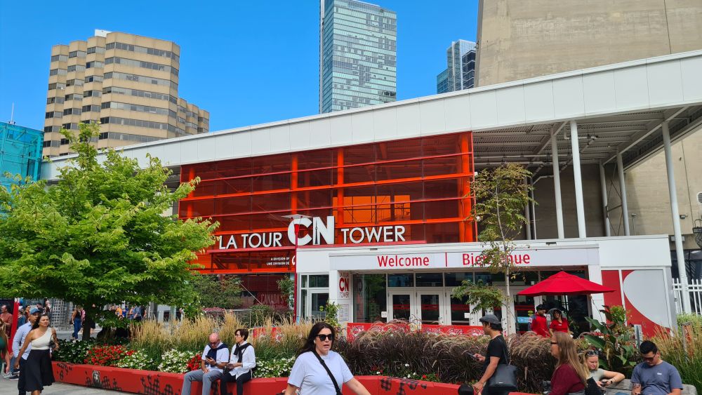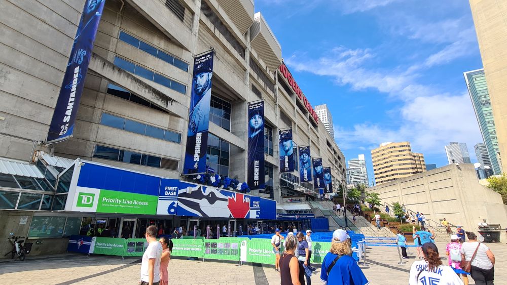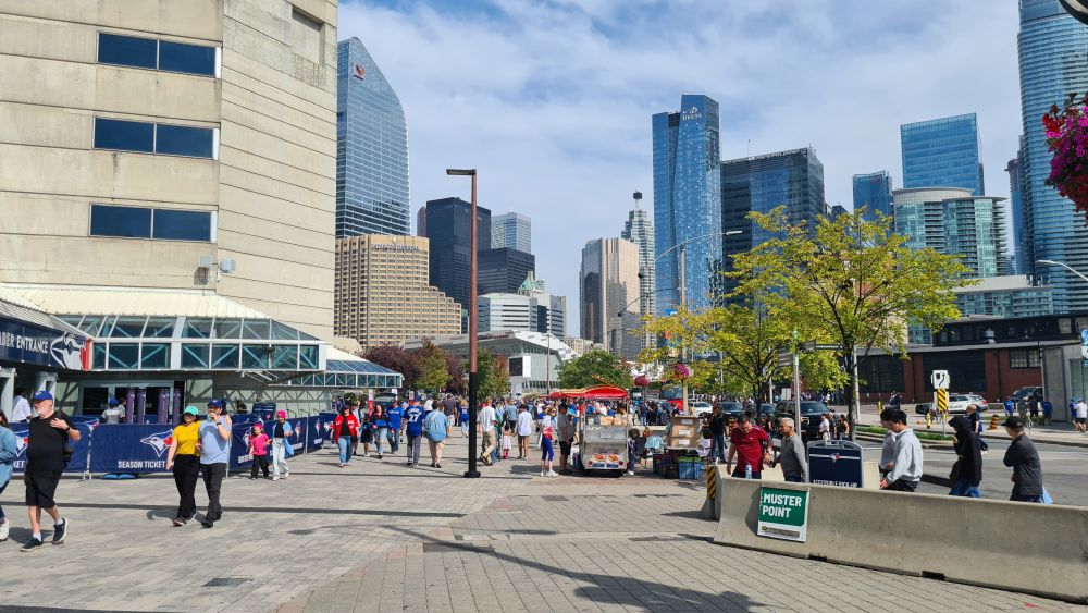 Heute wollten wir zum CN Tower und danach mal weitersehen. Der Tag begann schon sonnig, beste Voraussetzungen, um von dort oben die Stadt und das Umland zu sehen. Wir sind mit der Straßenbahn gefahren, die Haltestelle war ja direkt vor der Tür. Auf dem Weg zum Tower sahen wir schon die Rogers-Arena, dort sollte an diesem Tag ein Baseballspiel stattfinden. Wir haben kurz überlegt, ob wir uns dies ansehen, haben uns aber dagegen entschieden, da wir in LA ja auch schon eines gesehen haben. Es war schon viel los, obwohl das Spiel erst zwei Stunden später anfangen sollte.
