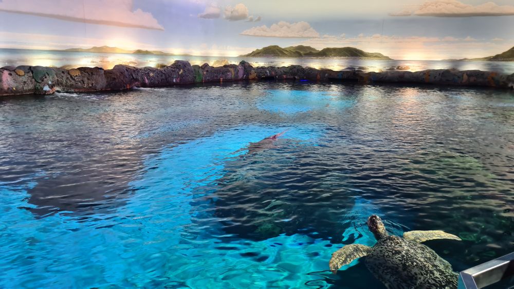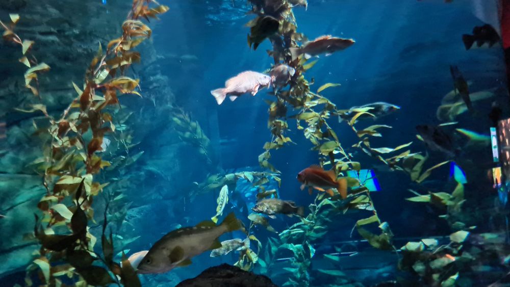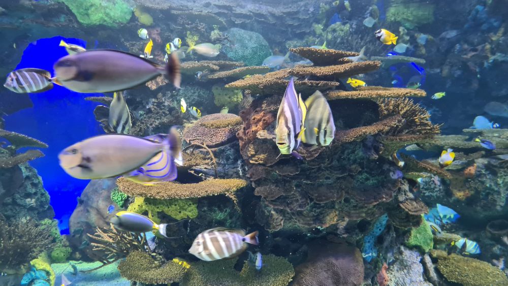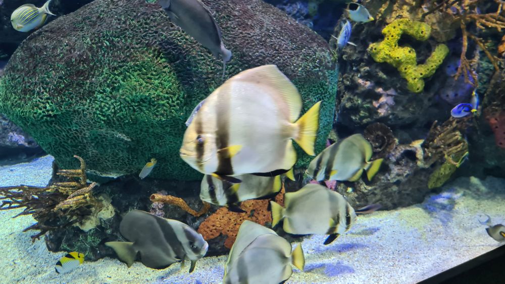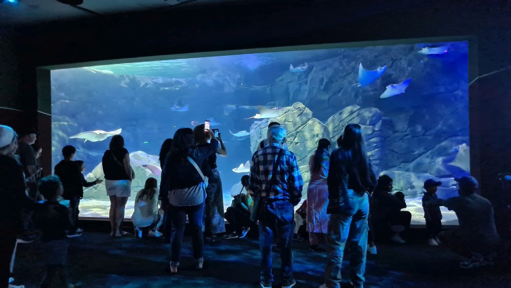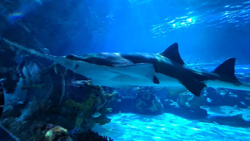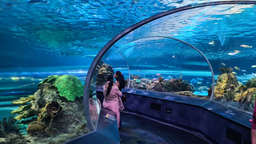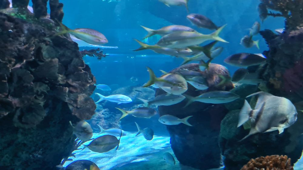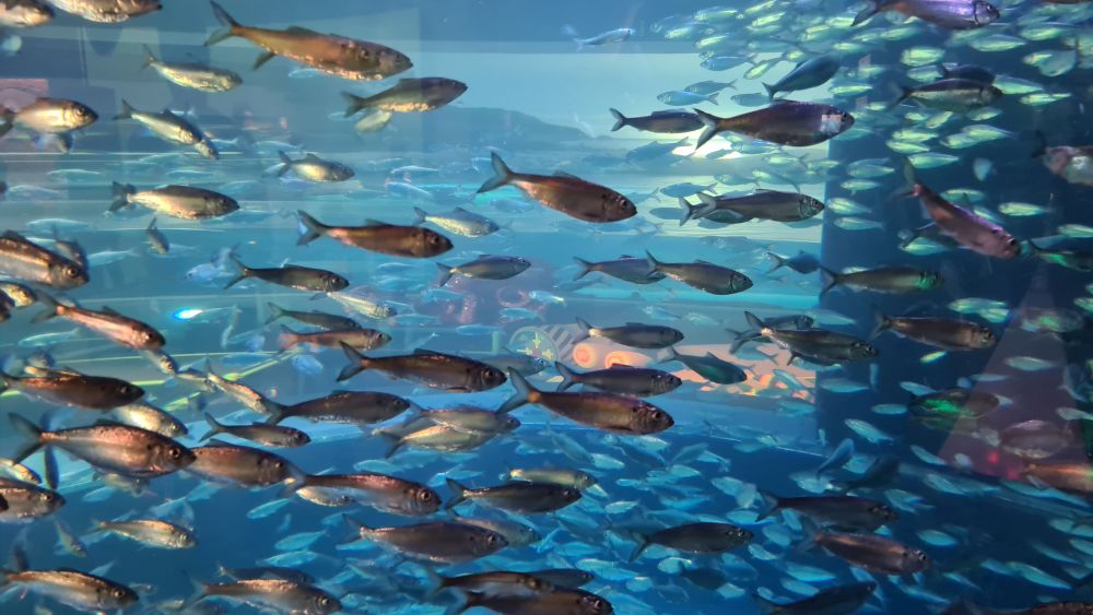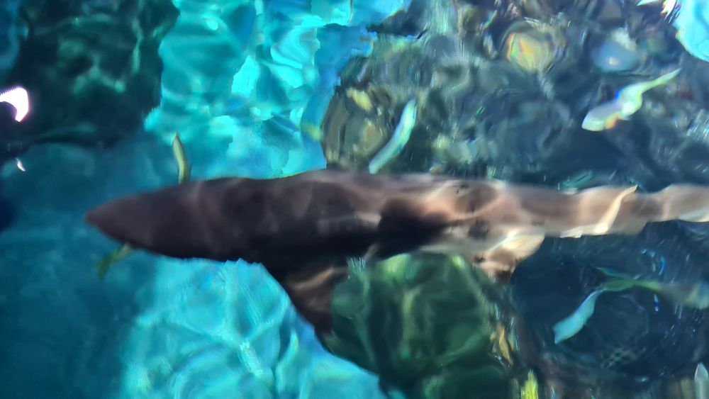 Und dann kamen wir zur Hauptattraktion: das große Aquarium, in denen auch Haie schwammen. Auf einem Laufband wurden wir etwa 15 Minuten lang durch das Aquarium gefahren. Da war so beeindruckend, dass wir die Fahrt gleich zweimal gemacht haben.