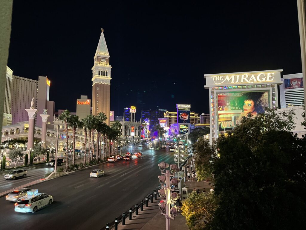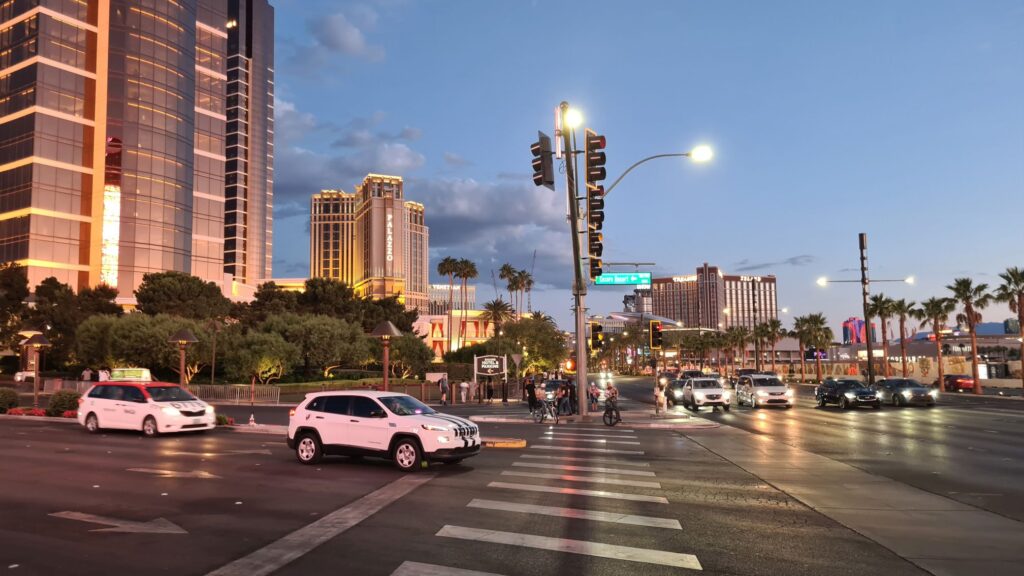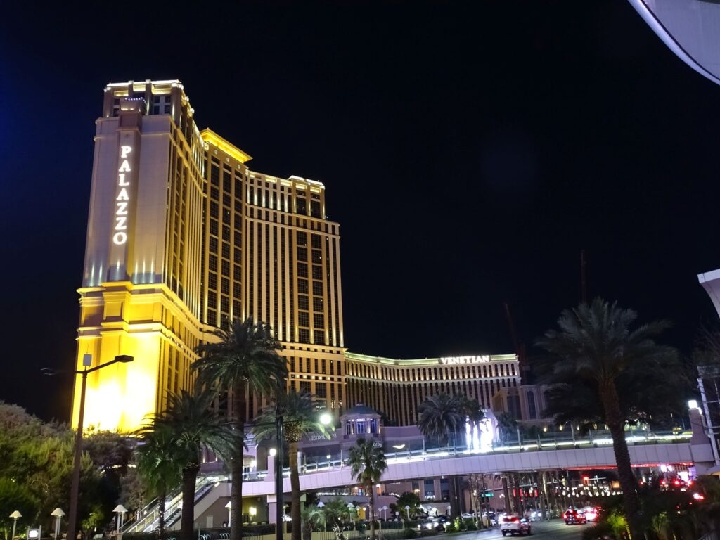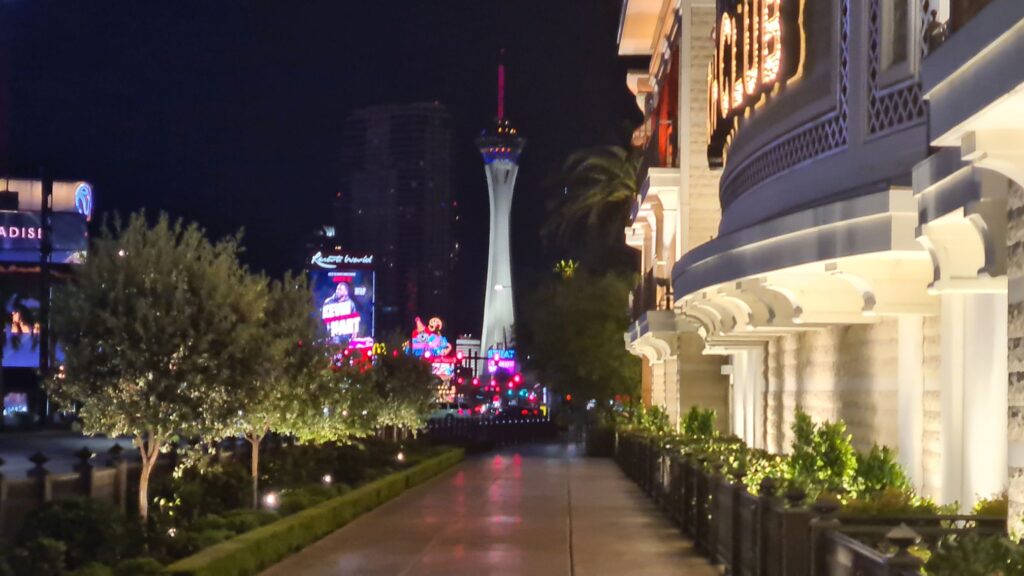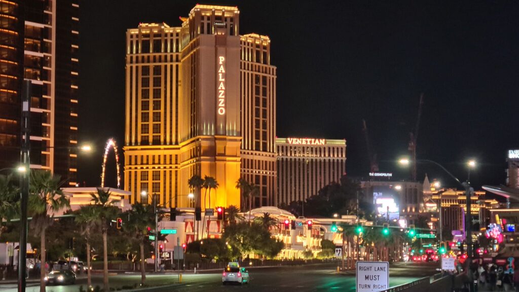 Zum Abendessen hatten wir uns ein Buffet in einem der zahlreichen Casinos vorgenommen, eine Recherche zeigte dann aber, dass nach Corona noch längst nicht alles wieder so war, wie davor. Längst nicht mehr jedes Casino bot ein Buffet an, einige auch nur zum Frühstück und mittags, andere auch nur an bestimmten Tagen. Also sind wir so los und in der einsetzenden Dunkelheit den Strip entlang gegangen.